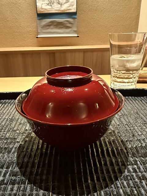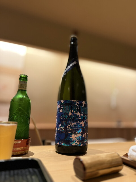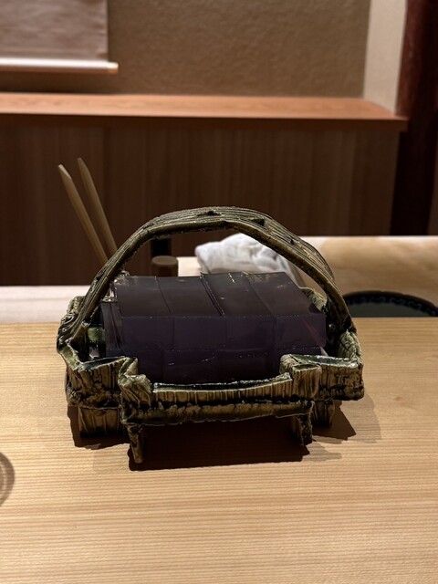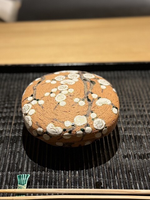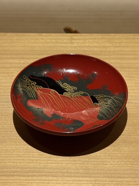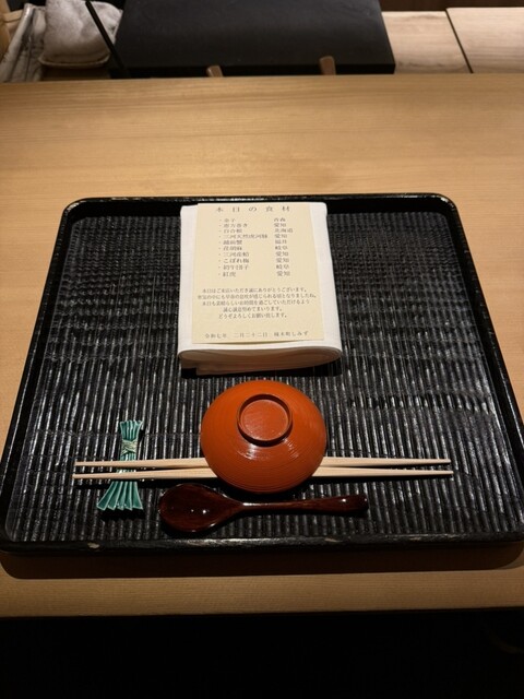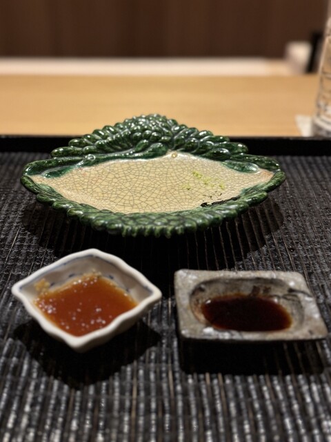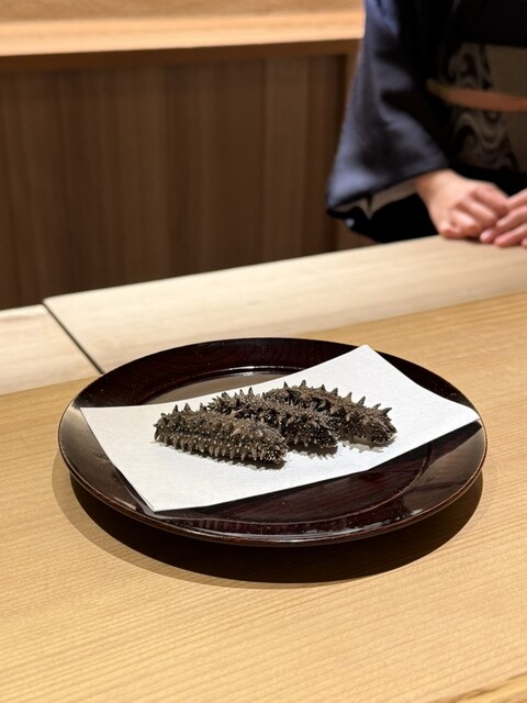 金子を鬼が持つ金棒に見立てる一品ですが優しいお味の養老蒸しに海鼠の食感と磯の風味、そこへこのわたを削った塩を落とすスタートから沼りそうな至極の品でございます。続いての恵方巻きは蕎麦寿司です。花わさびと豆まきの豆、カニ(他の方は牡蠣なのですが苦手な自分の為に別物を作って頂きました)
