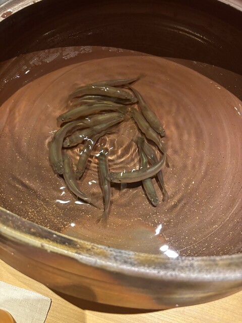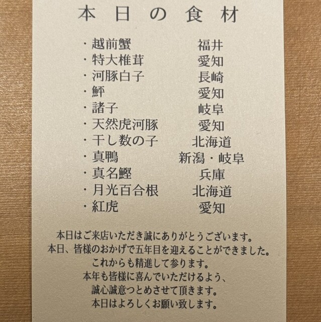 料理の写真は禁止です。食材はOK(岐阜の本湖月スタイルだそうです。)盛り付けが美し過ぎるので残せないのは残念です。