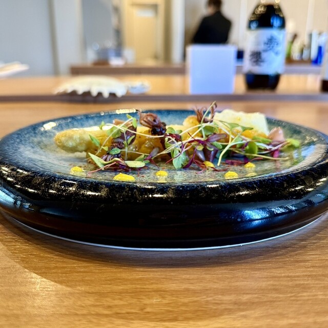 ホワイトアスパラのベニエの上から、アプリコット、ケイパー、ホタルイカ、柑橘などを盛り付けた美しい料理。ふっくらとした衣の中にアスパラガスの甘味が詰まっていて、ホタルイカや柑橘との相性も抜群です。