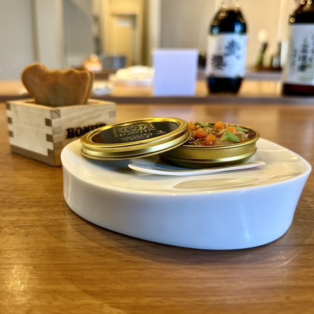 ほうろくチュイルと同時に提供いただいた、トマト、アボカド、車海老、キャビアなどをキャビア缶に盛り付けたアミューズ。キャビアの塩味に、トマトの酸味、車海老のねっとりした食感など、様々な味を同時に楽しめます。