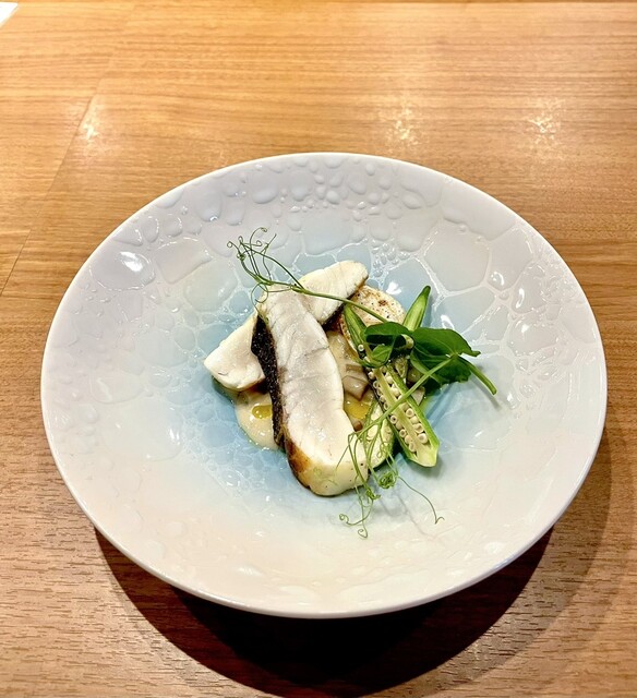 ⑤ 風間さんの神経締め鱸 ・師崎産の鱸 オクラ、蕪 魚出汁とバターのソース
