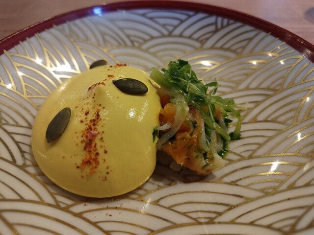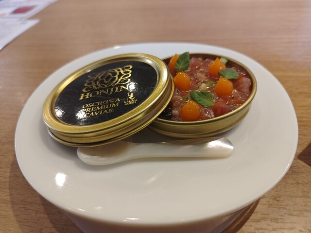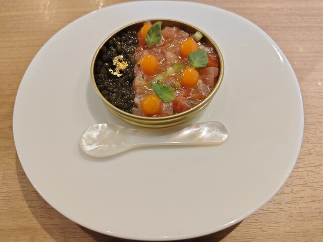 キハダマグロはタルタル。キャビア缶に盛りつける演出に胸が弾む。名古屋コーチン卵黄のムースにアボカド、そしてキャビア。物凄くリッチな味わい。
