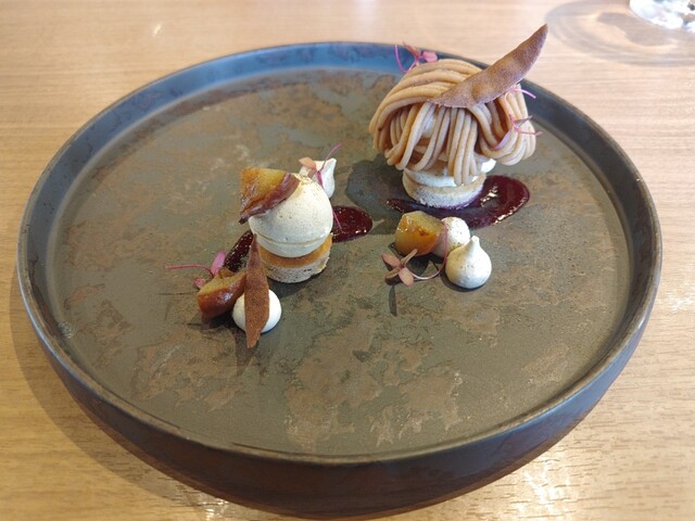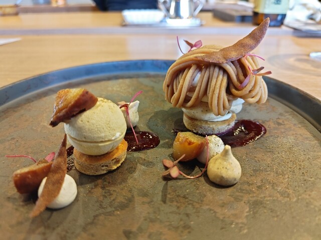モンブランはスポンジ生地ではなく、(たぶん)焼きメレンゲに栗のペースト。それに栗風味のアイスクリーム。