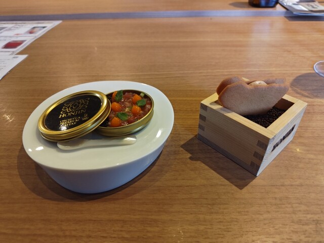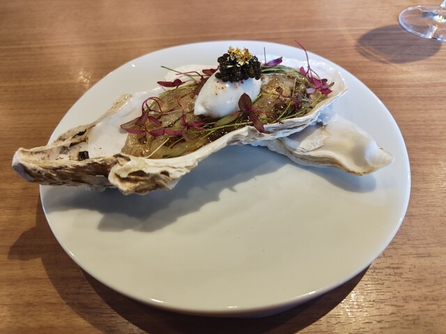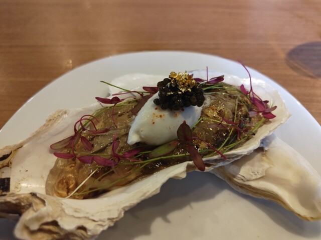 大きな牡蠣に海苔のジュレと酒粕とチーズ(だった気がする)のアイス、そしてキャビア。