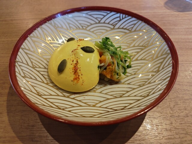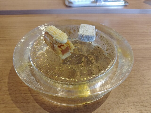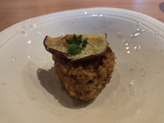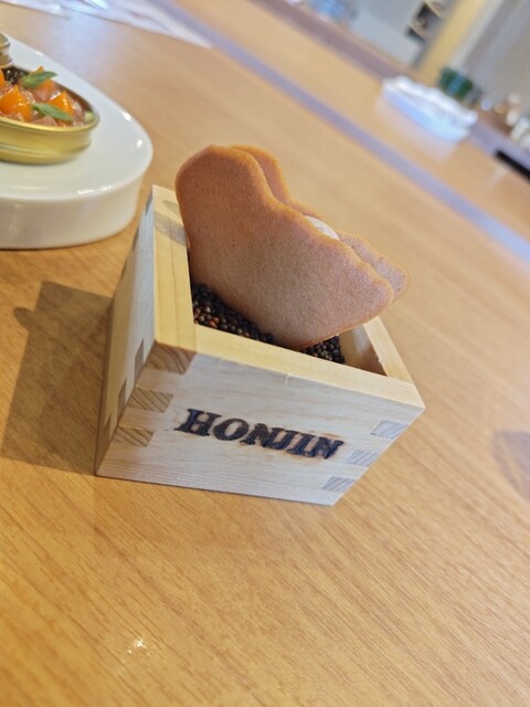 食事前に小さなココット鍋。中には焼く前のパン生地らしき物が。食中に出すフォカッチャをこれから焼き上げるとの事。オリーブオイルではなく、先述の菜種油を使うところに愛知のテロワールを感じた。