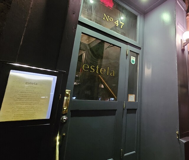 ニューヨークにあるニューアメリカン「Estela」。ミシュラン2024★。某フード誌が選んだ「2014年にオープンした全米のレストラン」の第3位に選ばれた店。照明暗めでさほど広くない店内は、人が通れないほど賑わっている。イタリアンにもスペインにも寄りがちなニューアメリカン。アンティーヴのサラダ、イカ墨リゾット、リコッタダンプリングなど、どれもシグネチャの名品が並ぶ。品数は決して多くないが「またあれが食べたい」となる名店。