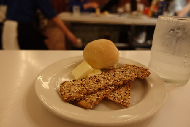 私がNYに最初に行ったのは1991年だからもうかれこれ23年前になる。それからほとんど毎年行っているのだが行くたびに新しいレストランができたり、今まであったなじみのお店がなくなったりとNYの移り変わりをわずかではあるが見てきた。しかしここ、グランドセントラル地下のオイスターバーは昔から全く変わらない。入口の扉も全く変わっていないし中のテーブルも椅子も変わっていない。唯一変わったところは店に入らずに窓越しに立ち食いで牡蠣を食べることができる場所があったがその窓がふさがれたぐらいであろう。古き良き時代のNYがここにある。この店は大人数で行っても大丈夫だし、一人で行ってもカウンターがあるので気楽に立ちよることができる。普通のテーブルでもよいがおススメは入口から入って右奥のカウンターであろう。ここは席が狭く隣の人と方が触れ合うぐらいではあるが料理人たちの仕事をまじかに見ることができる特等席なのである。私がいつも注文するのはパンローストミックスである。これは牛乳に何か香辛料を混ぜてその中に魚介類を入れてさっと煮込む料理である。その煮込んだものをお皿にパンを入れてそこの上に流し込む。とっても簡単な料理なのであるがここでしか食べることができない非常に美味なものである。値段は中に入れる魚介によって違うがオイスターのみだとだいたい15ドル、ロブスターとか高級材料を入れると25~30ドルぐらいになる。
