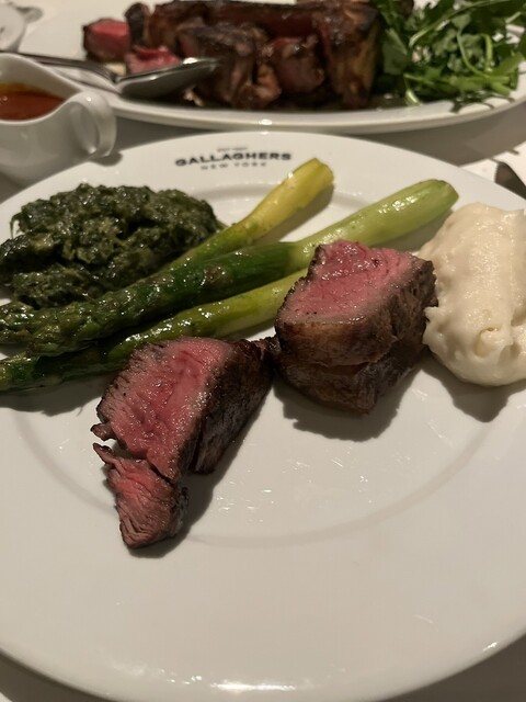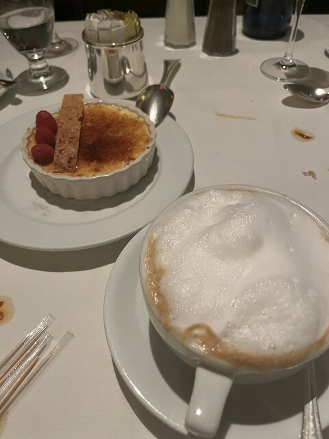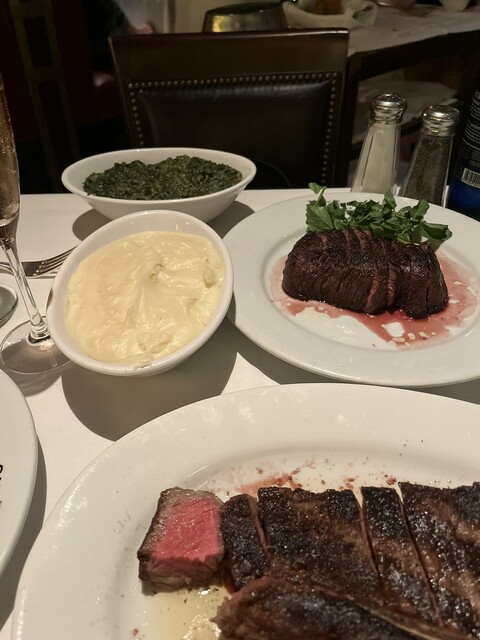 最高のワインで最高のステーキでした。フィレミニオン、とニューヨークTボーンをいただきました。Tボーンはさすがに相当なボリュームで圧倒されました。すごいですね。フィレはとても柔らかく、おいしかったです。赤身のお肉はやはりアメリカが一番おいしいのではないでしょうか? 日本の霜降り肉と異なり、たんぱくで脂身が少なく食べやすいです。アメリカではやはりステーキを食べるのがはずさないですね。クリームブリュレもおいしかったです。スピナッチもおいしかったです。かなりバターがきいてました。それからおいしいアスパラガスも最高でしたね