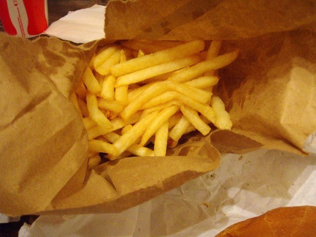 5分ほどでオーダー品が出来上がりました。出来上がると、名前を呼ばれるのですが、日本人の名前は言いにくいのか、つっかえるので、気が付きやすいです。(笑)クラフト紙の袋に入れらたフライドポテトとバーガーが登場。バーガーの番号は注文したものがわかるように記載されたもの。