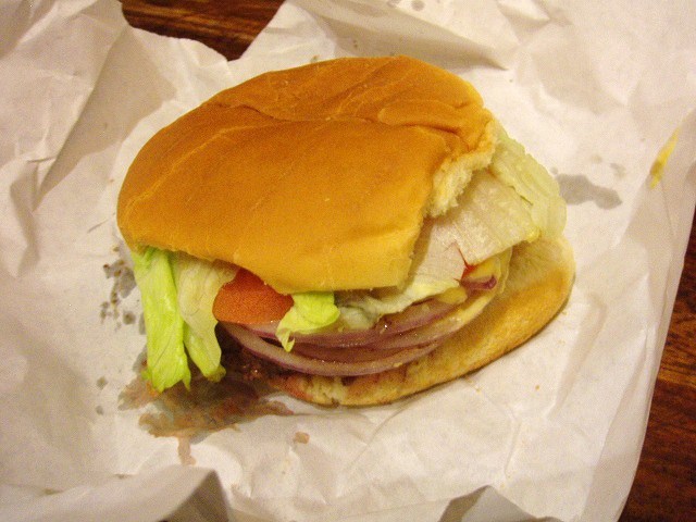 ミディアムの焼き加減のパテに、レタス、トマト、玉ねぎ、ピクルスを挟み、ソース抜きにしたもの。マクドナルド風の柔らかい(ぺしゃんとつぶれた?)バンズに、厚みのあるパテが挟まっています。ソース抜きにしたので、シンプルで、素材の味をそのまま味わうバーガー、パテがジューシーで、ボリュームがあり、美味しいバーガーです。