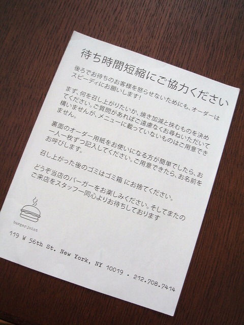 並んでいる間に、好みのバーガーをオーダーする用紙に記入。もちろん、口頭で言ってもよいのですが、もたもたしていると行列の後ろに迷惑がかかるので、これをスタッフに渡すことで対応できるのは便利です。