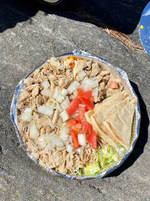 サフランライスの上にチキンと牛肉、野菜がたっぷり乗っていて、