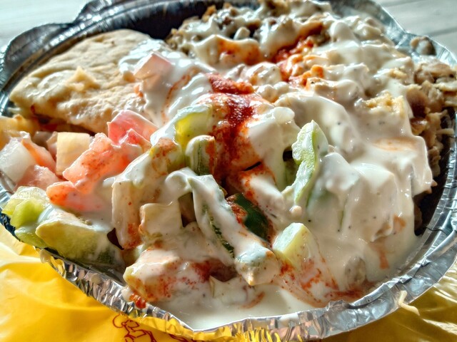 香ばしいチキンとビーフジャイロ、みずみずしい野菜、ほのかな酸味とコクのあるホワイトソースに、旨辛なホットソース。肉と野菜を軽く混ぜ、ライスと一緒に頬張ると間違いなく旨い。