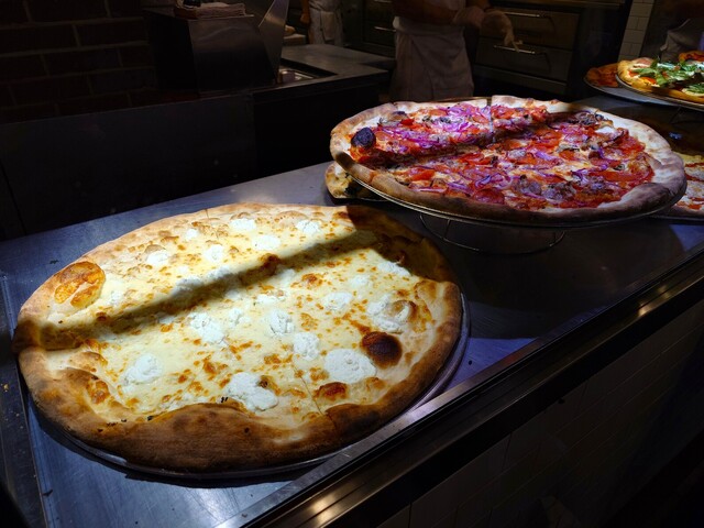ピザは1スライス$4.5〜6.5程度。注文後にオーブンで焼き直してくれるので、いつでもアツアツの状態で提供されます。