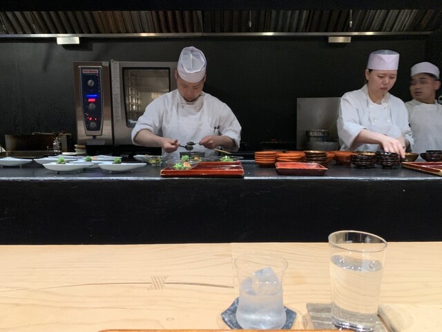 ミッドタウンの二つ星割烹。日曜ランチの利用。部分的に改装した店内、待合のバーはそのままです。カウンター奥に個室あり、カウンター・個室共に満席。NYなので期待低めでしたが、味付けなかなかいいです。毎日打っているという蕎麦、締め具合良く乗せてあるハドソン川の鴨、炙り直後で旨し(//∇//)
