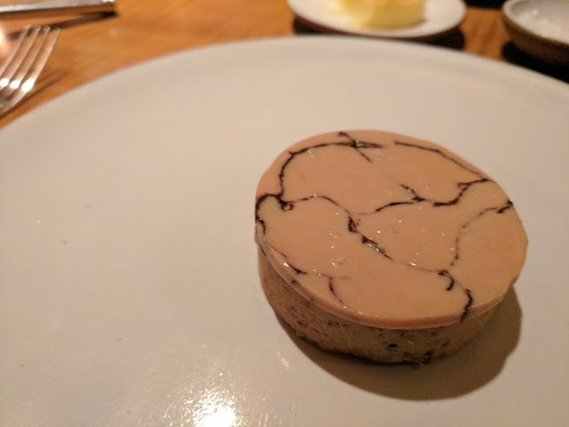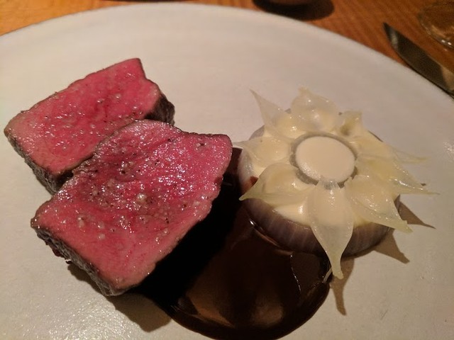 フォアグラは梅とココアと混ぜられて面白いケーキ状にて登場。梅の酸味とフォアグラの重厚さがココアに包まれて美味しかったですが、何口も食べると少し重たく感じました。何にせよフォアグラをこのような形で食べたのは初めてだったので新鮮でした。