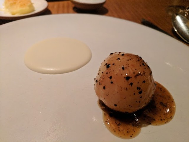 Google Photos洋梨のソルベ。やはり海外にくるとどうしてもデザートは甘く感じてしまいます。キャラメルソースがわずかに入っていて濃厚な甘さ。この後、チョコプレッツェルも提供されたのですが、こちらは塩味が効いた甘さ控えめのデザートでコーヒーに合っていました。
