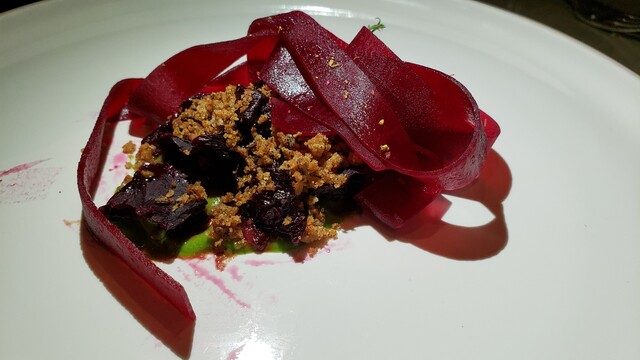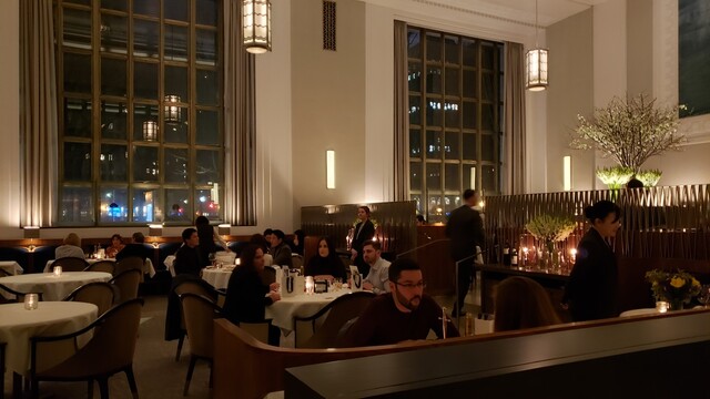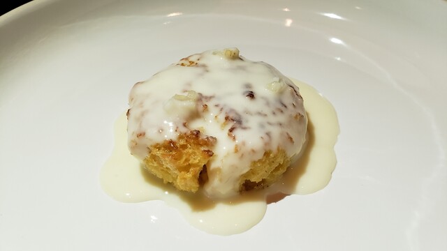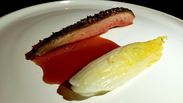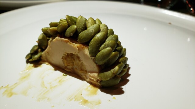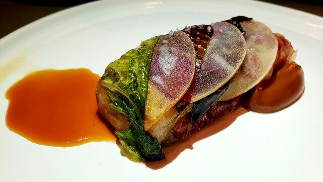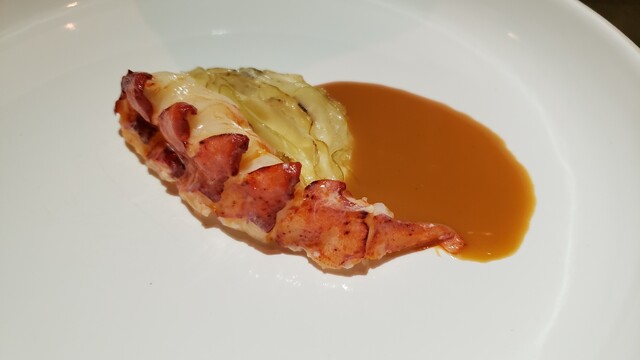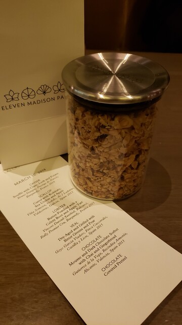 ニューヨークにあるフレンチレストラン「Eleven Madison Park」。ミシュラン★★★。2017世界のベストレストラン1位。出だしは、あさり、ネギ、ポテトの温かいスフレに、冷えたキャビアとサワークリームをトッピングするこの店定番の料理。温と冷、別々に供することで、口の中で混ざる瞬間に料理が完成するよう計算されている。テーブルから椅子、調度品から食器類に至るまですべてオリジナル。料理の独創性だけでなく、あらゆる機材を駆使した、エンタテインメントを盛り込んだサーブは、最近の高位レストランの定番スタイル。ペアリングは、食後酒まで含めたっぷり饗される。