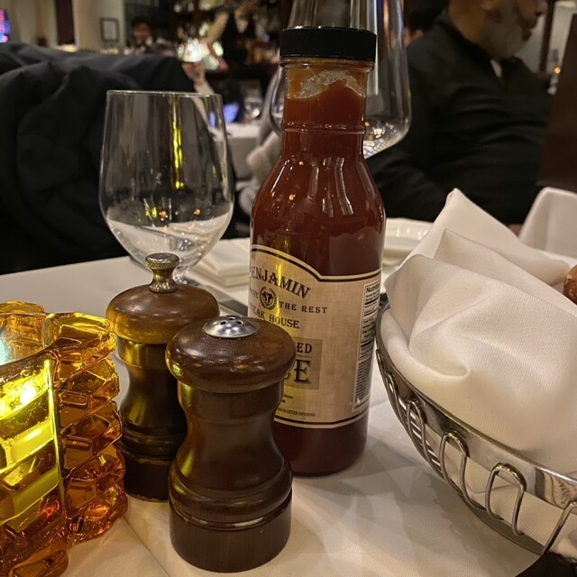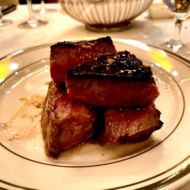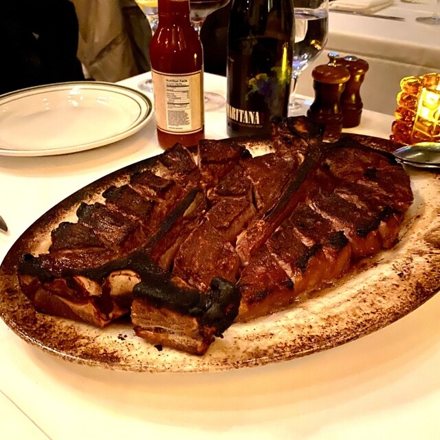 ピータールガー式というか流というか、USDAブラックアンガスのTボーンを仕入れ、店裏で程よく寝かせ、天火で焼き、バタでグレイズして皿ごと再びオーブンにぶち込んで仕上げる、といういっけん乱暴に見えながら、その実、肉の出来上がり、過不足のないメイラード反応、風味と温度調整が高いバランスで出来上がってくるステーキ https://youtu.be/l9mvXwQg6ew を、本店のブルックリンまで行かず、クレジットカードでの支払いにも対応している、ミッドタウンにある「のれん分け」的一軒。