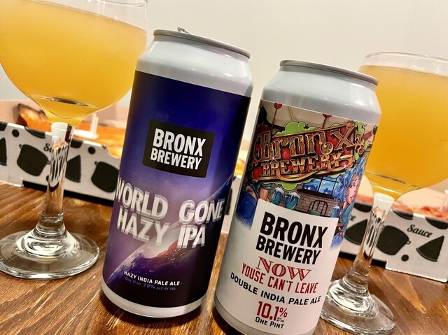 ピザに合わせた、BRONX BREWERY の World Gone Hazy IPA と Now Youse Can’t Leave。