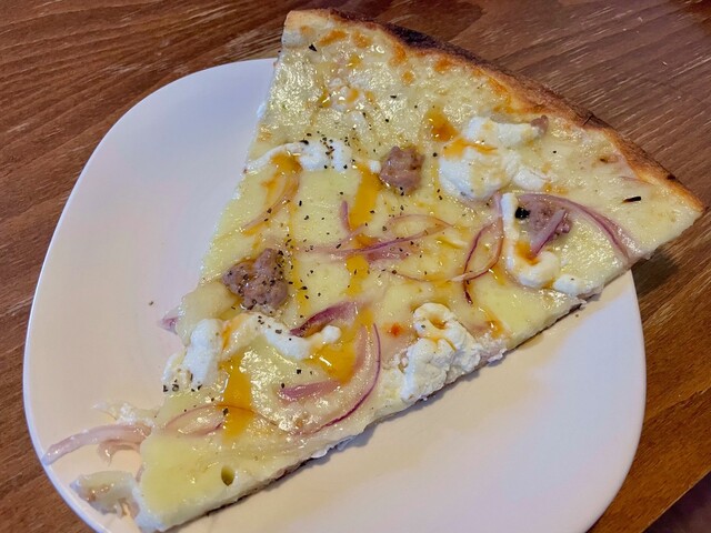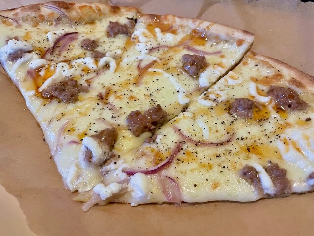このお店の特徴でもあるとても薄いカリフラワークラストの上に厚みのあるモツァレラチーズとリコッタチーズの層、その上をソーセージとレッドオニオンがシンプルに飾っています。付け合わせの蜂蜜を好みでかけて頂きます。美味しいですね。