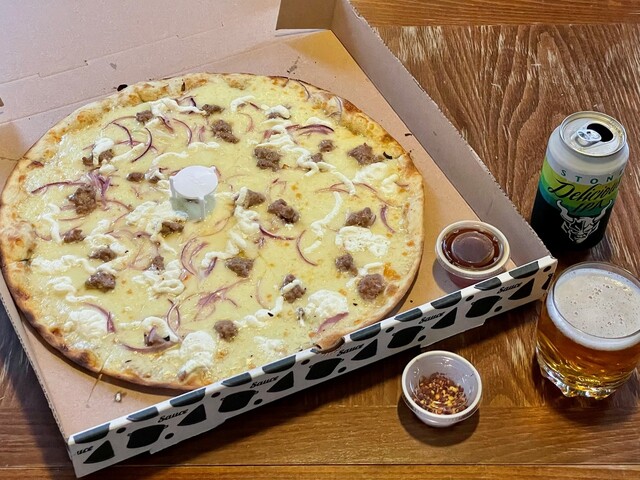 写っているビールが16oz缶(日本の500ml缶相当)なので、ピザの巨大さが分かると思います。