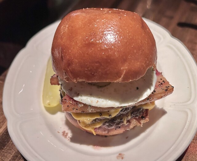 ダブルチーズバーガー: ベーコン、目玉焼きのトッピング追加