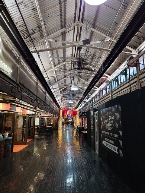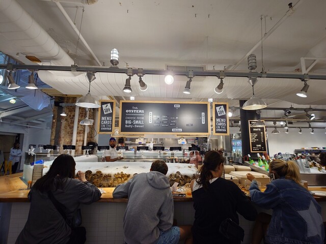 旧ナビスコ工場の遺構を残しつつ、白を基調とした空間は、活気のある海鮮市場のような雰囲気。
