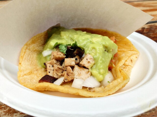 目の前で焼き上げられるチキンは香ばしさがたまらない旨さ。サルサの爽やかな酸味とアボカドのコクが重なり合い、小ぶりなサイズながらギュッと凝縮された、バランスのよいおいしさが楽しめます。