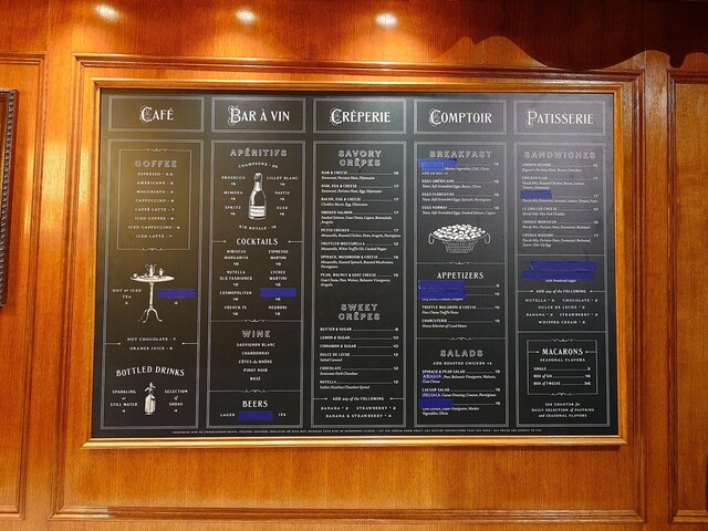 メニューは、甘いデザート系クレープから、ハムやチーズ、卵を使った食事系クレープまで、幅広くラインナップ。サンドウィッチやサラダ、マカロンなどもあり。