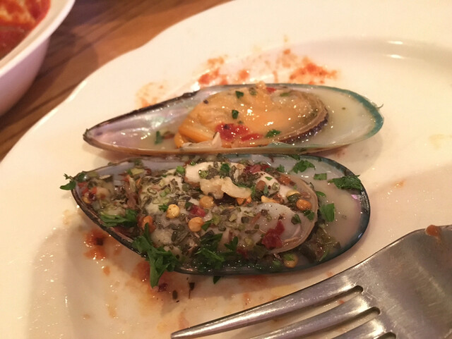 注文したのは、サラダとミートボールとムール貝とピザです。