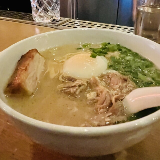 ラーメンの具は、ほろほろの厚切りチャーシュー、ほぐれた肉、温玉、ネギでした。