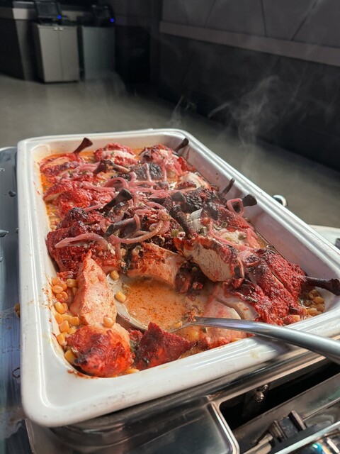ゴルフの打ちっぱなし施設の中に、バーカウンターやテーブル席などがあり、ビュッフェ形式での食事が提供されました。