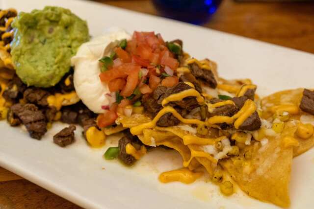 このナチョスうまい!サワークリーム、アボカド、トマト、チーズ、ステーキ、コーン!