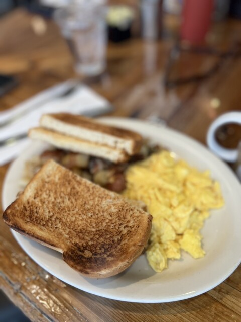 2 eggs, 2 bacon or sausage, JNJ potatoes, and toast