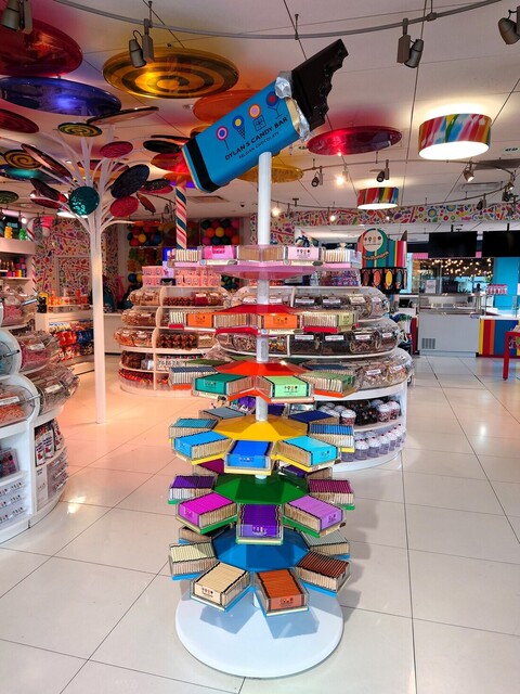 The store features a vibrant and fun design with colorful displays, overflowing with a wide variety of gummies, candies, ramune, chocolates, and other sweets. Included among them are items from well-known brands like Jelly Belly and M&M's, as well as the store's original chocolate bars and sweets from Japan.