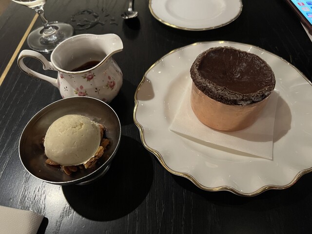 チキンレバームースのブリオッシュ、カニのクリーム和え、メインをハリバットと豚肉のトマトソース煮込み、最後にスフレ。