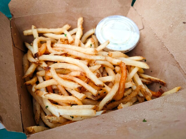 These classic French fries are crispy on the outside and fluffy on the inside. They are served with a garlic parsley aioli for a flavorful dipping sauce.