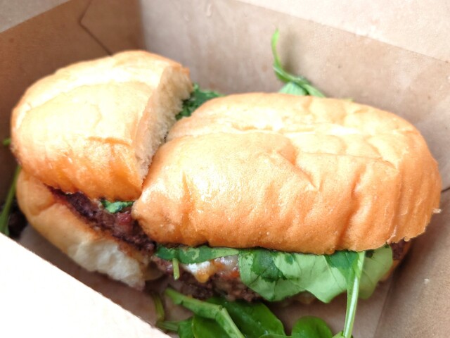 このバーガーは、焼き加減が選べるジューシーなビーフパティに、ベーコン、キャラメルオニオン、グリュイエールチーズ、特製のブルーチーズスプレッド、ルッコラが加わった、風味たっぷりの構成。具材の組み合わせにより、旨み、塩気、そしてほのかな酸味が絶妙なハーモニー。バランスのとれた味わいが非常に魅力的。