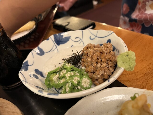 ホルモン焼き、オクラと納豆の山かけをツマミに、鍋焼きうどんを食べました。海老の天ぷらはきちんと別皿で提供されるのが良いですね。