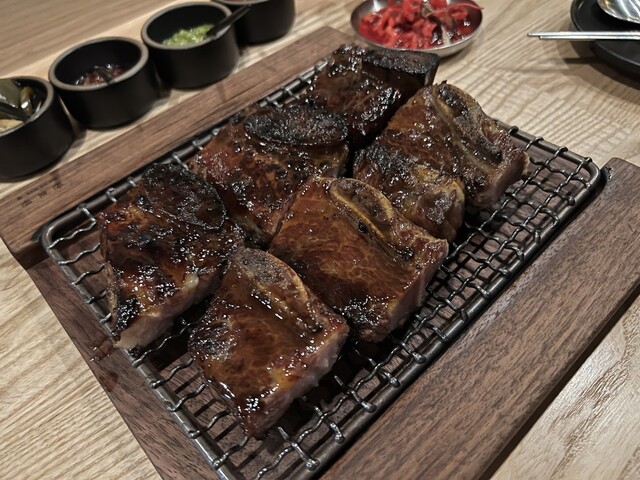 山芋のパジョン、骨つきカルビはかなりの厚切り、野菜のビビンバもちょうど良いサイズに明太マヨが美味しいです。