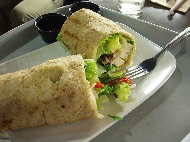 シーザーサラダにグリルチキンが入ったサラダラップ、野菜もさることながら、大きなチキンがたくさん入っていたのが食べ応えがあってよかったとのこと、旦那は大きな口を開けてうれしそうにほおばっていました。