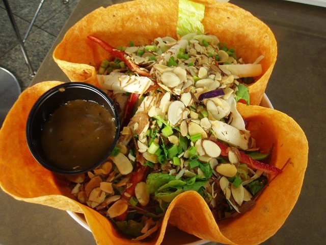 トルティーヤの器に入ったたっぷり野菜に、クリスピーなトッピングが乗せられています。少し甘目のセサミドレッシングとの相性がよく、美味しい。とろみがついたドレッシング、買って帰りたいと思うほどマイルドで美味しいもの。そして、トルティーヤの皮がパン代わりになり、軽い夕食として分量もちょうどよい。ドレッシングが別添えで、好みの量がかけられたのが良かったかなと。
