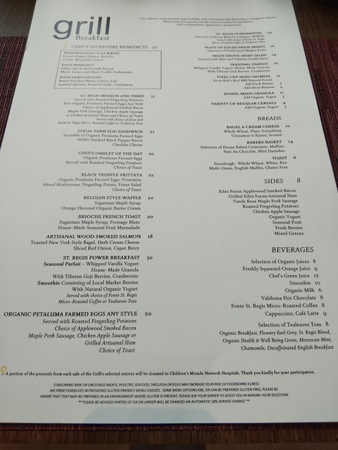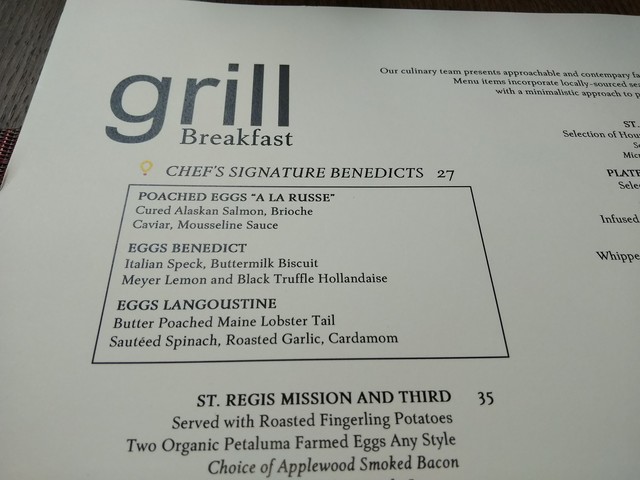 ブレックファストのメニューの最初にCHEF'S SIGNATURE BENEDICTS(27ドル)というものが3種類書いてある。相方はPORCHED EGGS “A LA RUSSE”というものを、僕はEGGS BENEDICTを頼んだ。それとコーヒーを2杯。