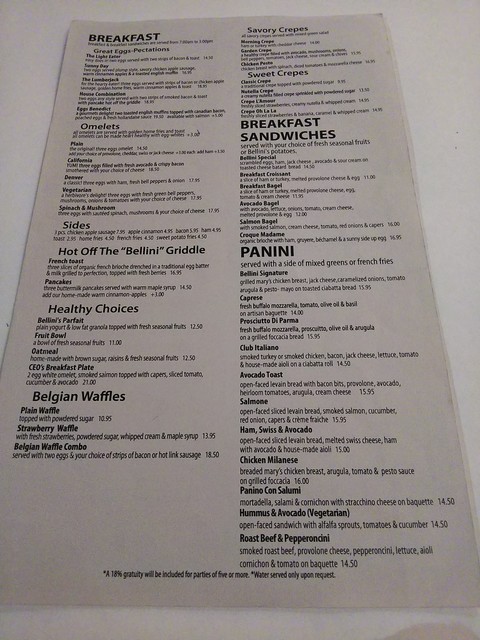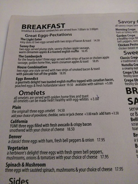 BREAKFASTのGreat Eggs PectationsからThe Light Eater(14.50ドル)を注文。内容は、two eggs served with two strips of bacon & toastと書いてある。玉子は僕も相方もサニーサイドアップで。トーストの種類も訊いてくれたので2人ともwhole wheat breadで。