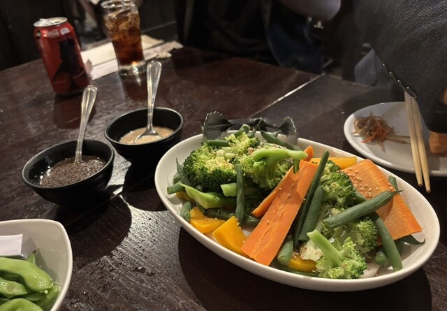 枝豆、きんぴらごぼう、温野菜、イカ焼き、