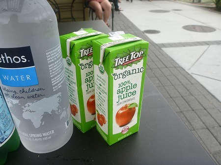 孫用のオーガニックリンゴジュース、水、アイスコーヒーを購入しました。