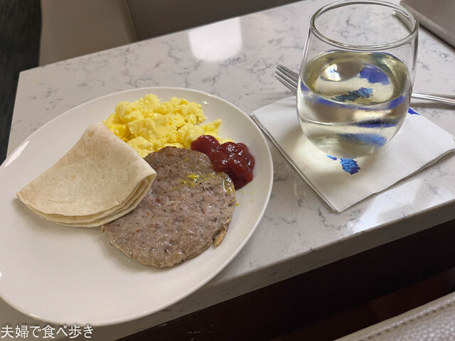 朝食時間帯、スクランブルエッグとソーセージをもらってくる。当初はハンバーグだと思ったけれど、これはソーセージだね。