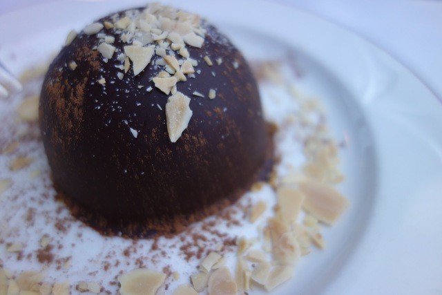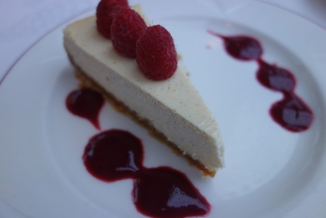 復路はのんびりとデザートをいただきながら。私はチーズケーキにグラン・マルニエの風味をつけたもの。これは実直な味わいでコストコのケーキのように美味しい。