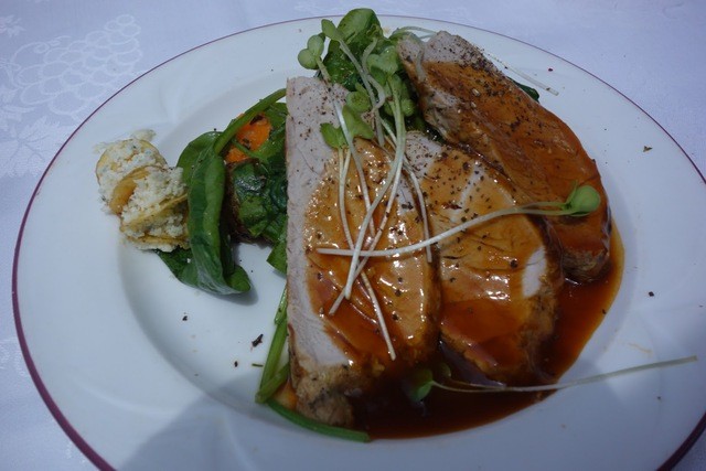 妻のメインは豚肉をマスタードでどないかしたもの。ソースが見るからに美味しくなさそうです。「もういいや、あげる」と、半分以上を私が引き受けることになりました。豚肉に合わせるワインはワイン単体だと深みがあって素晴らしいのですが、食事と合わせるとワインの力強さに豚が完全に駆逐されてしまっており、ワイントレインのワインは誰が監修しているんだと怒りがこみ上げます。